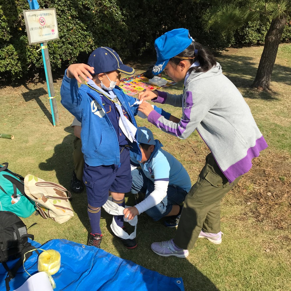 カブスカウト、ビーバースカウト、ベンチャー、ボーイスカウト、団 2018.11.03 千葉市少年三団体大会参加 投稿者: snomuravaunetsurfjp 投稿日: 2018年11月3日2018年11月4日 毎年恒例になっている市内のボーイスカウト、ガールスカウト、海洋少年団のスカウトが一同に集まる大会が千葉市役所脇の千葉みなと公園にて開催されました。一団メンバーも参加しました。今回のテーマは防災、減災、海抜3mを考えようです。助ける、持ち出し、連絡する等のポイントを8人一組で回るボイントラリーです。天気にも恵まれ、楽しく他団体との交流がでました。 五年賞の受賞スカウト 三角巾で手当てするゲーム 共有: Facebook で共有 (新しいウィンドウで開きます) Facebook LinkedIn でシェア (新しいウィンドウで開きます) LinkedIn いいね 読み込み中…