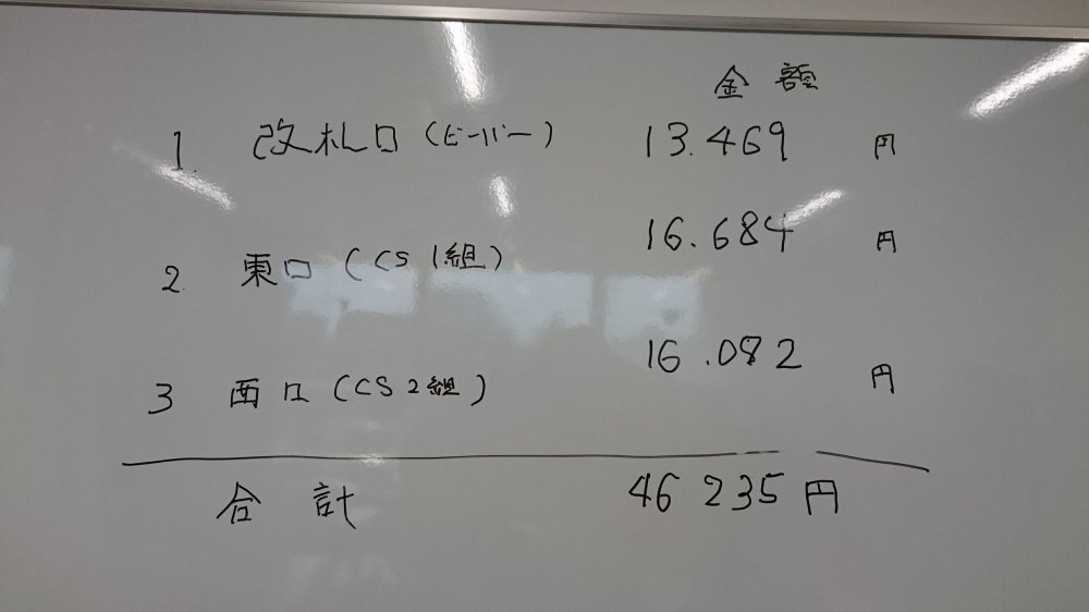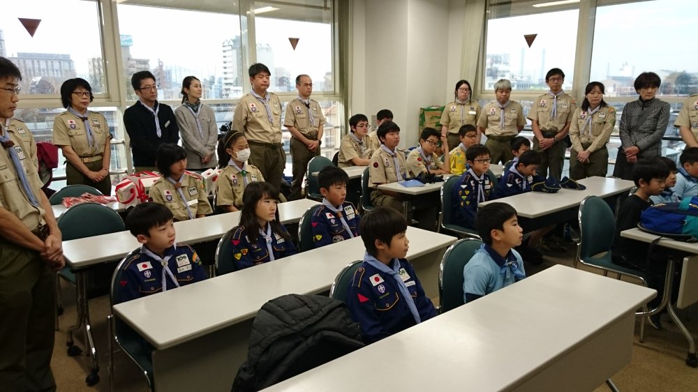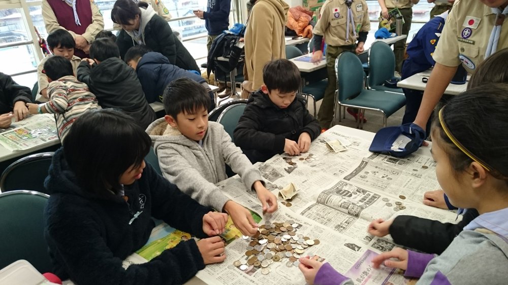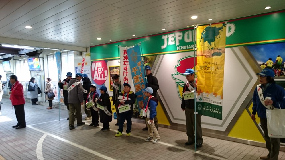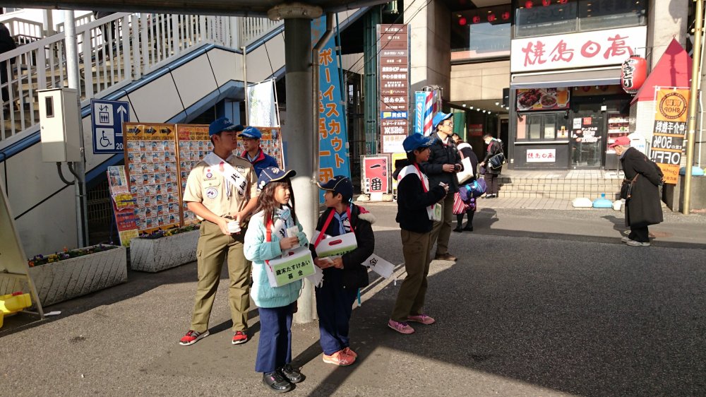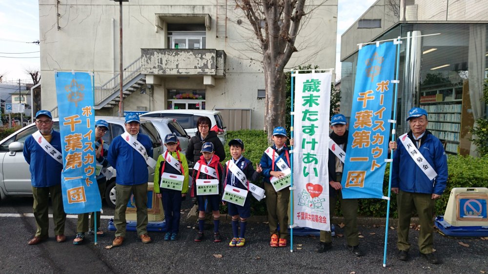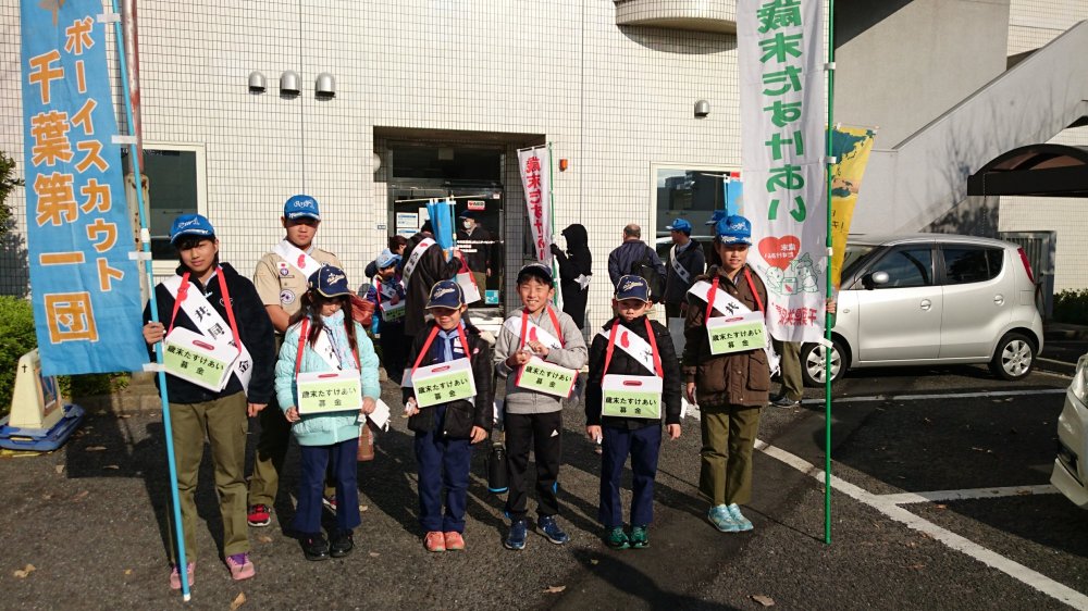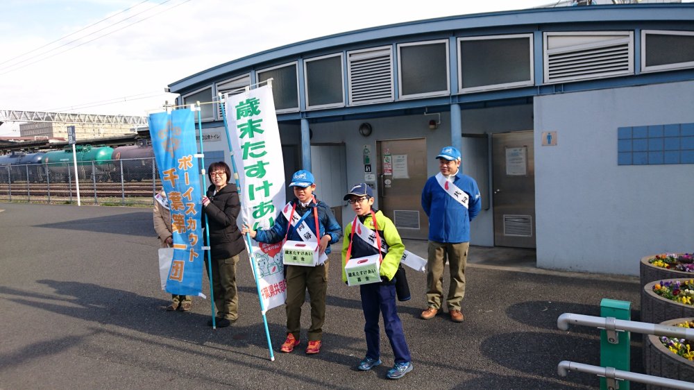 毎年恒例になっている千葉市福祉協議会の歳末助け合い募金活動をJR蘇我駅改札口及び周辺にてビーバー、カブ、ボーイ、ベンチャー隊で実施しました。当日の朝は特に寒かったのですが、蘇我コミにて募金活動の意義、募金の使われかた等を福祉協議会の方から説明を聞き、10時から一時間駅頭にたち大きな声で協力を呼びかけました。3組に別れて行いました。募金活動終了後、各組毎に募金額を計算し合計4万6千円代が集まりました。社会の為に役立てて欲しいです。その後育成会の皆さんが作ってくれたとん汁とフランクフルトと持参のおむすびを食べ午前中の予定を終了し、午後からは団、育成会のクリスマス会です。