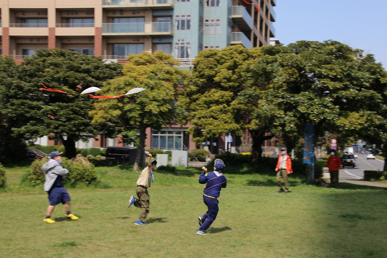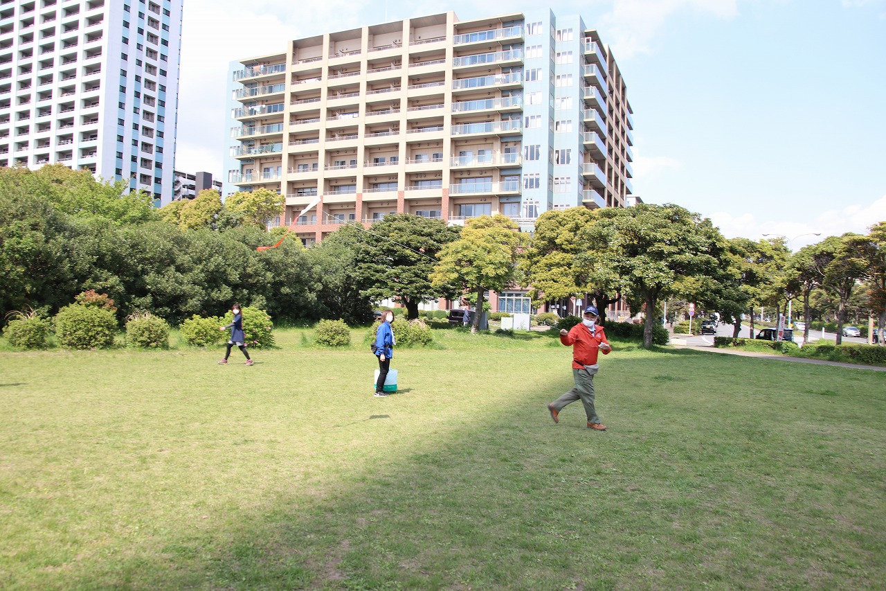 さて、本日の活動ですが、密に気を付けながら凧と羽子板に絵をつけ、ポートパークへ!
