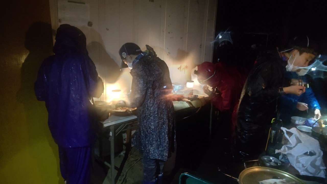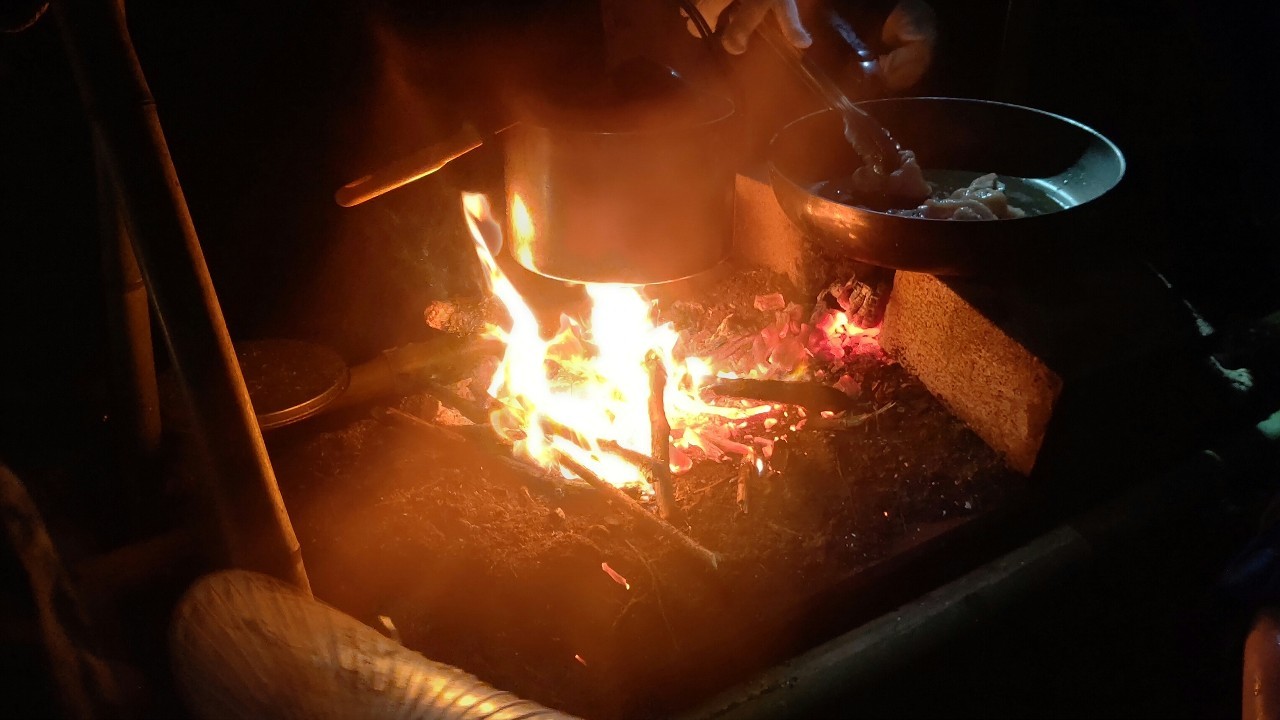 雨の中テントの設営、火起こし・・そして炊飯・・・