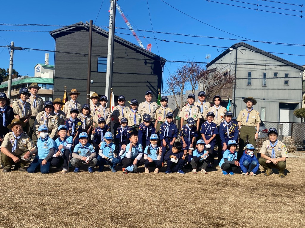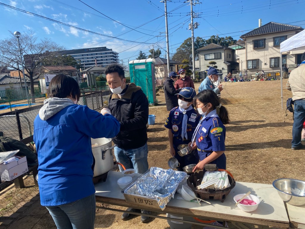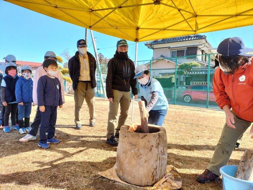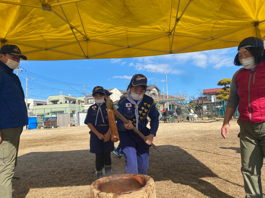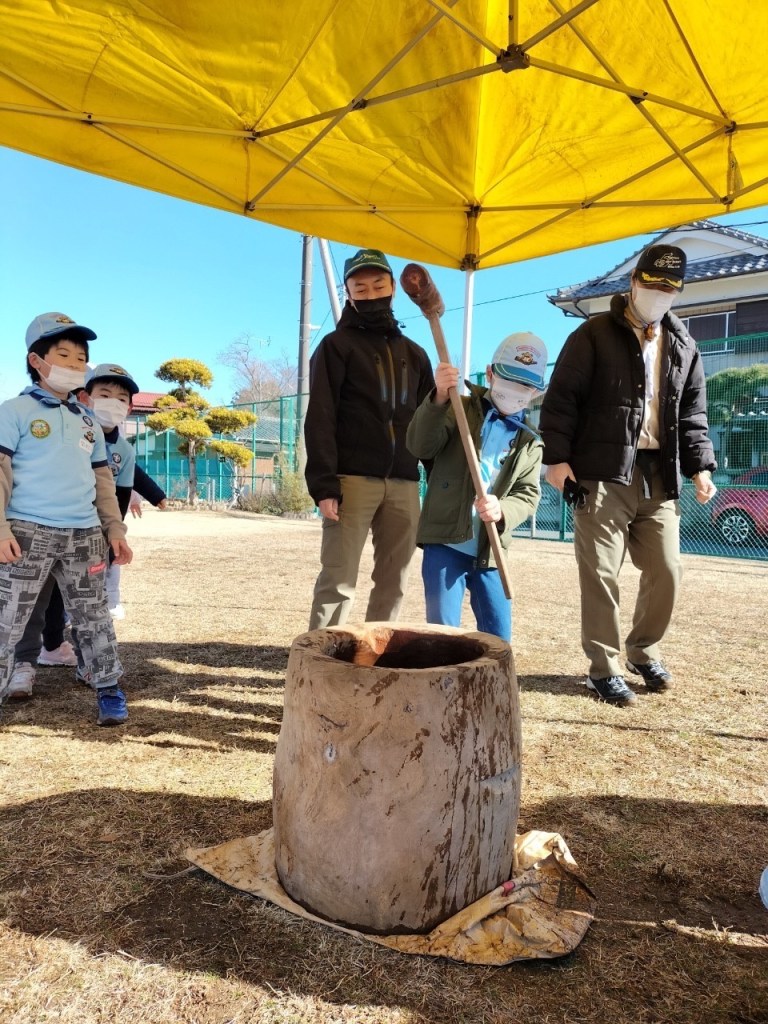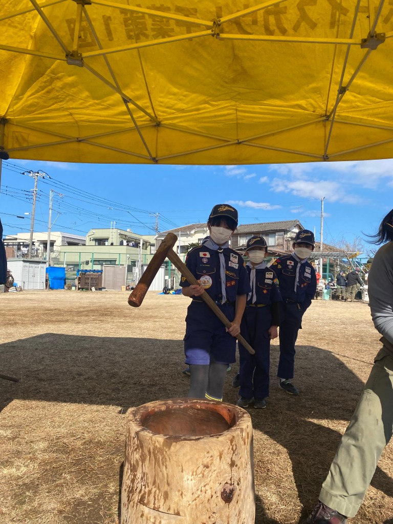今年初の団行事、新年餅つき大会を川戸市民の森に隣接する川戸手作り公園にて実施しました。2年振りの餅つき大会、心配された天気は寒かったですが。青空に恵まれました。開会式後、育成会、団委員の皆さんが餅つきの準備、ビーバー隊は楽しいゲーム、カブ隊は公園清掃を行い、餅つき準備ができた段階で各隊スカウトは餅つき体験をしました。そして、カブ隊はノリ、きな粉餅、ボーイ隊はお汁粉、ベンチャー隊はお雑煮とそれぞれ準備して、自分たちでついたお餅に舌鼓を打ちました。その後、長縄跳び、ドッジボール、サッカー、フリスビーなど楽しみました。今年も怪我、事故なく楽しい活動ができますように。