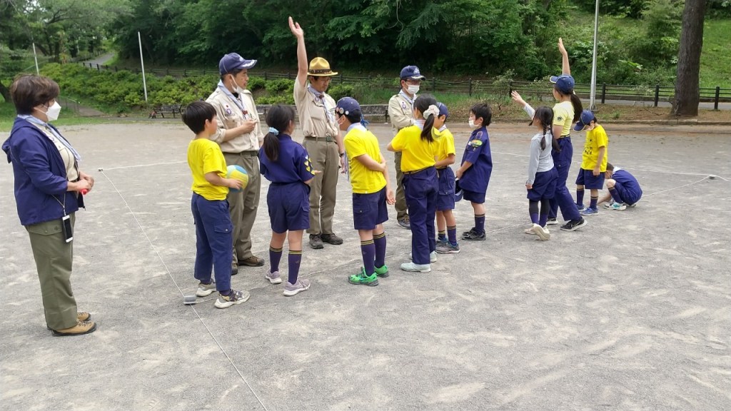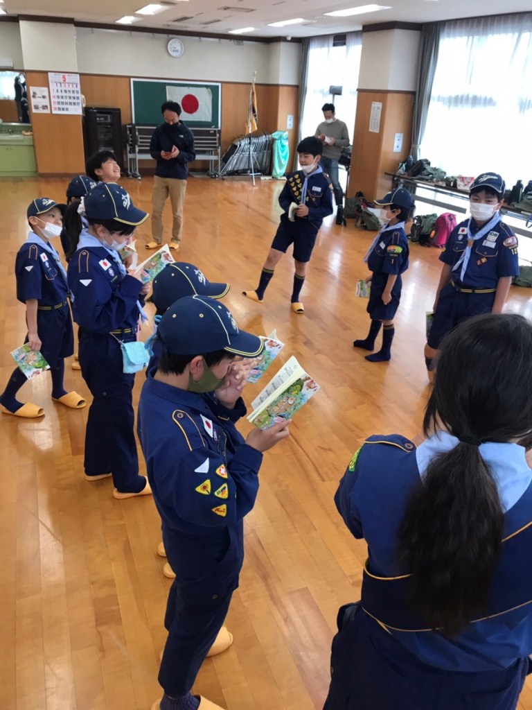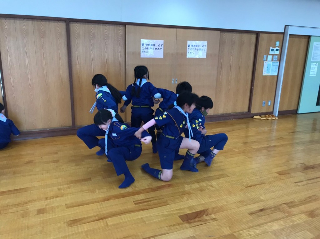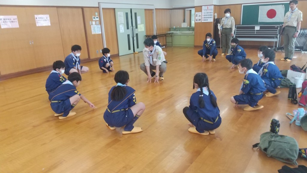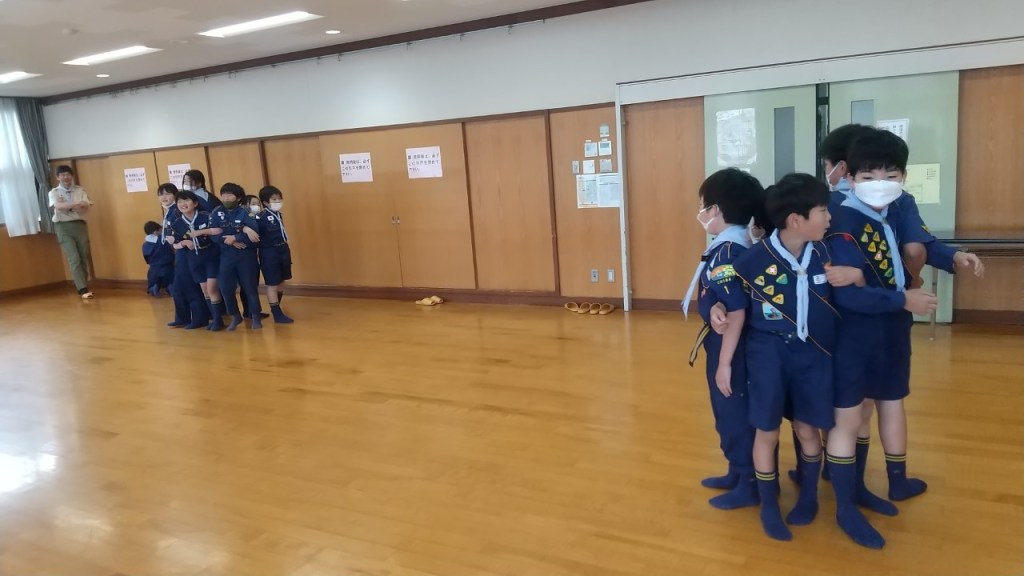 少しひんやりする中、集合したカブ隊。大きな声で挨拶すると、活発に遊び始め、帽子を床に滑らせて目標物までの距離が近い方が勝ち!と競争していました。