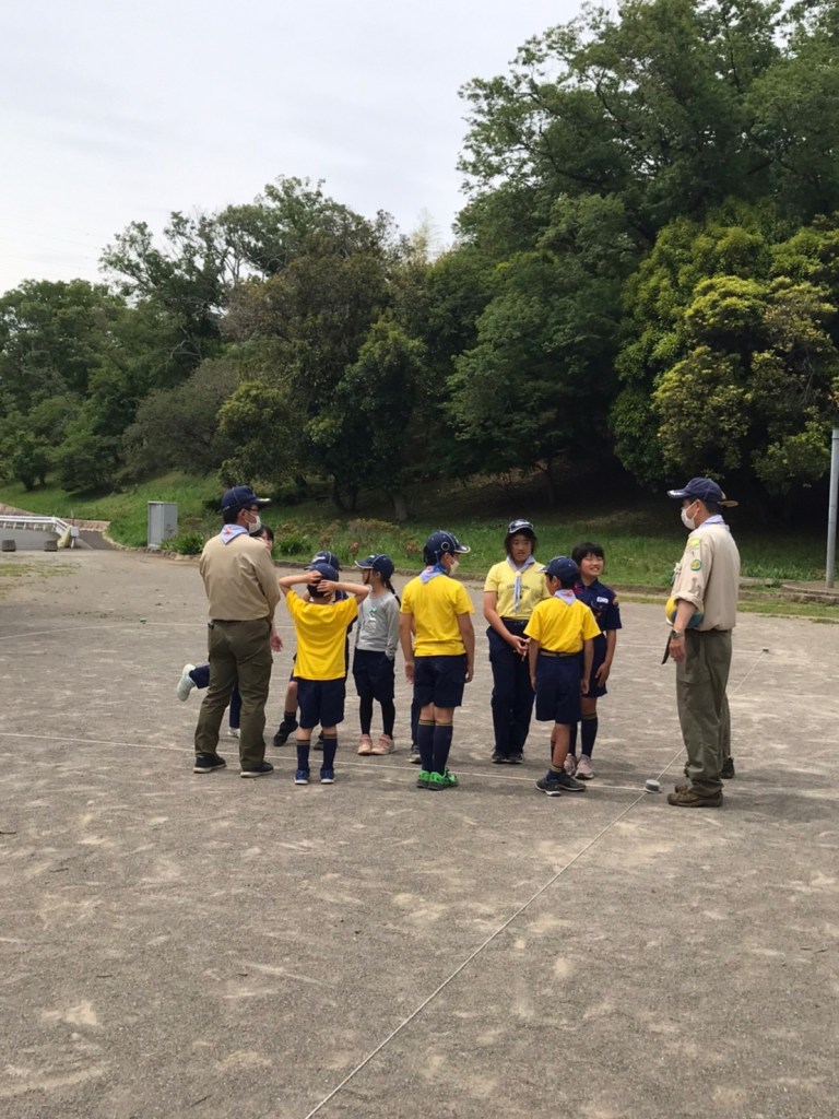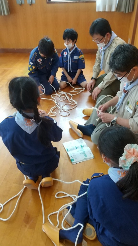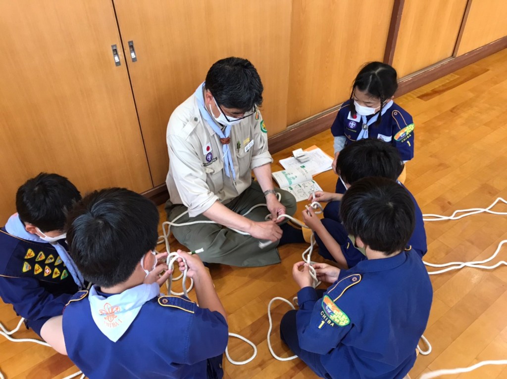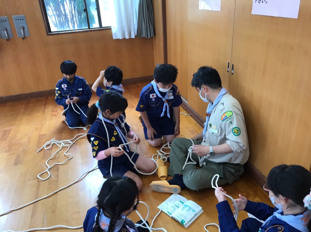 少しひんやりする中、集合したカブ隊。大きな声で挨拶すると、活発に遊び始め、帽子を床に滑らせて目標物までの距離が近い方が勝ち!と競争していました。