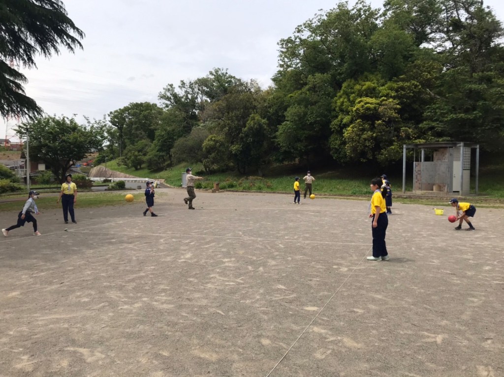 進級してきた3年生には初めてのカブ弁でのお昼ごはんでした。午後のドッジボール練習の頃には蒸し暑くなってきて、半袖でドッジボールを頑張るスカウトたち。