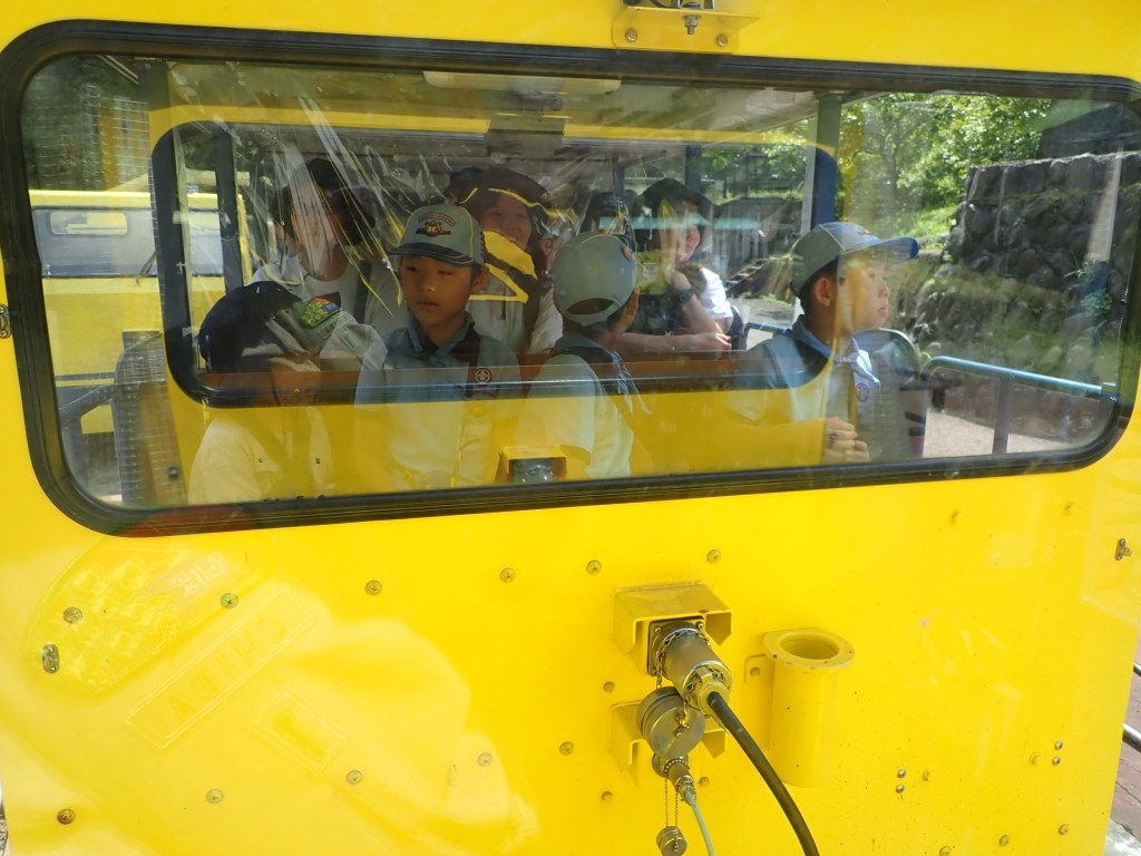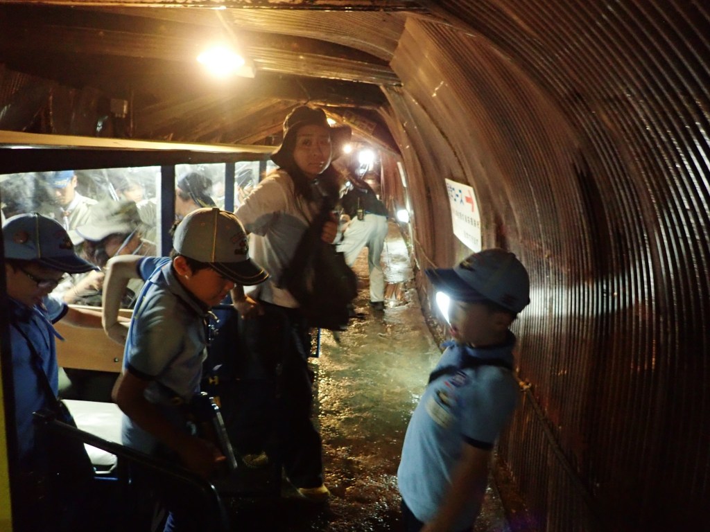 バスはみんなをのせて足尾銅山へ。到着すると、トロッコ列車に乗って中まで入ります。銅山のトンネルの中は、外よりは涼しいので過ごしやすかったかな?トロッコ列車は途中までなので、降りた後は坑道の中を歩いて見学しながら進みます。まるで今も掘っているかのような、作業者たちの人形もあって、暗い中でしたけど、勉強になりましたね。