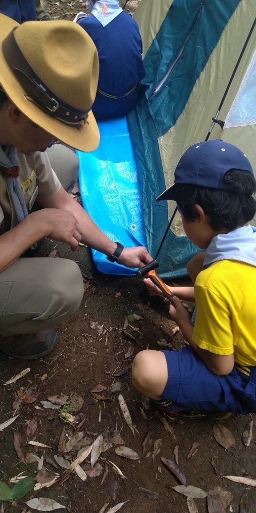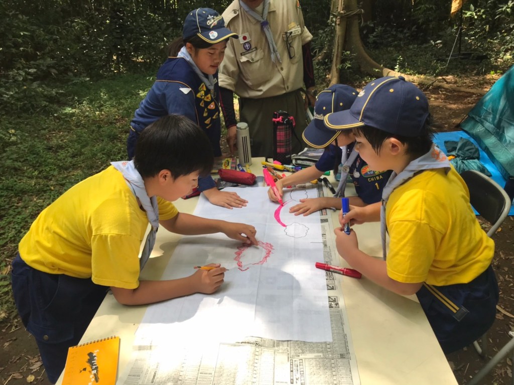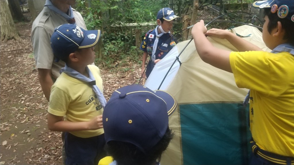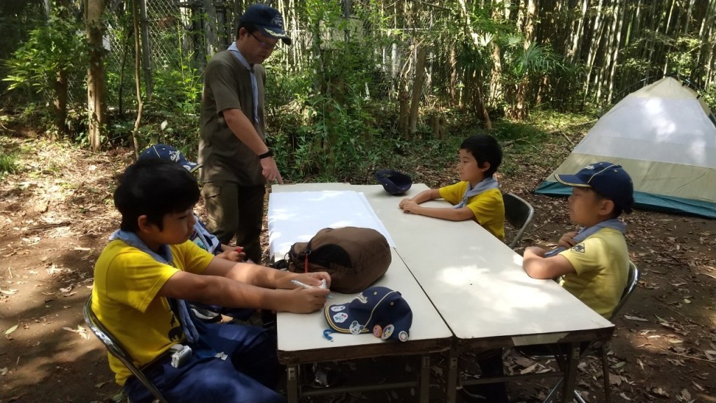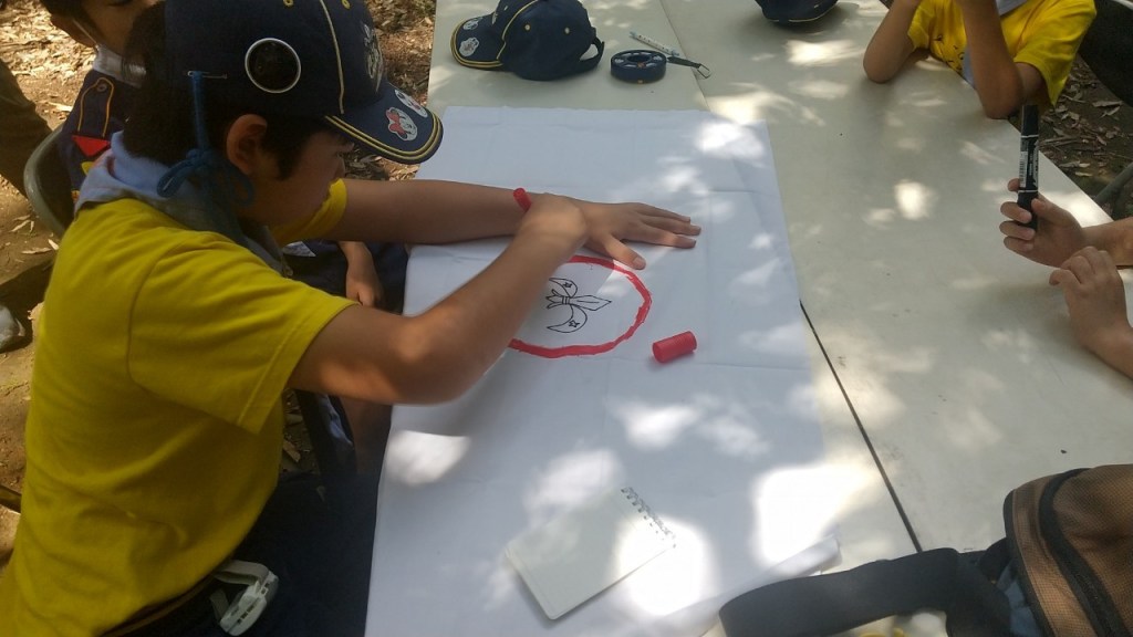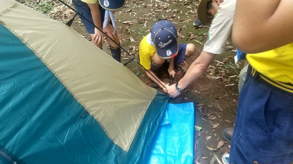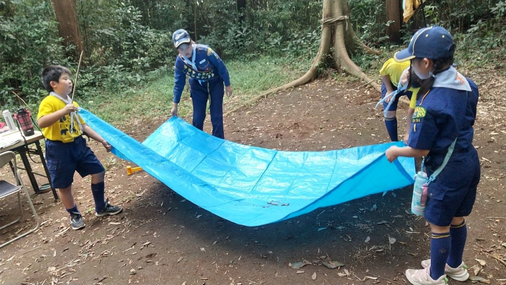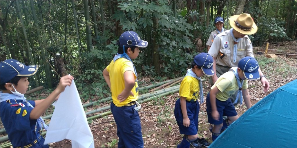今日は組別に別れて、テント張りと来週の秘密基地に使う旗作りをしました。