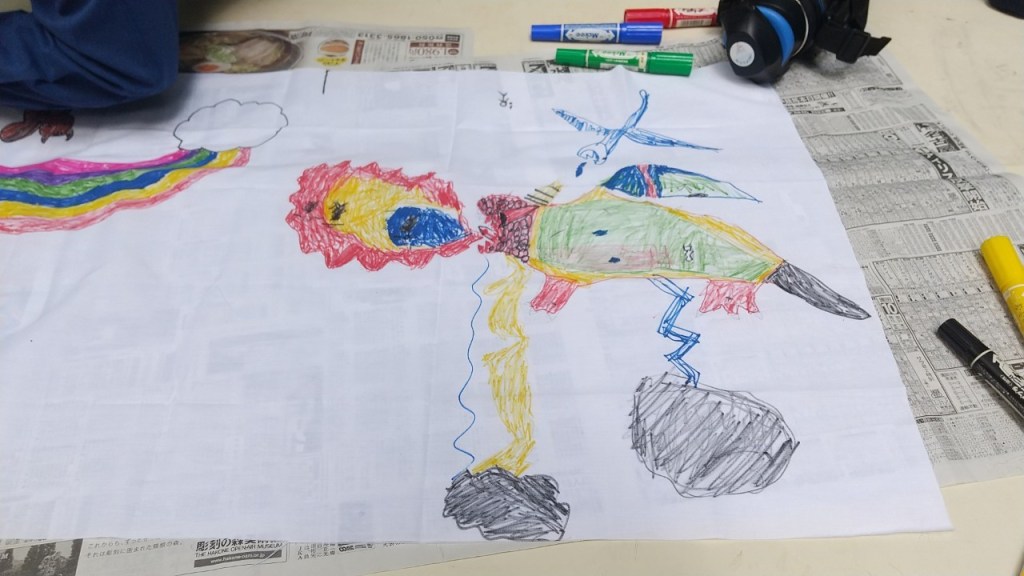 旗作りでは何を書くかアイデア出しからです。男の子と女の子で表現したいものも違うようでした。