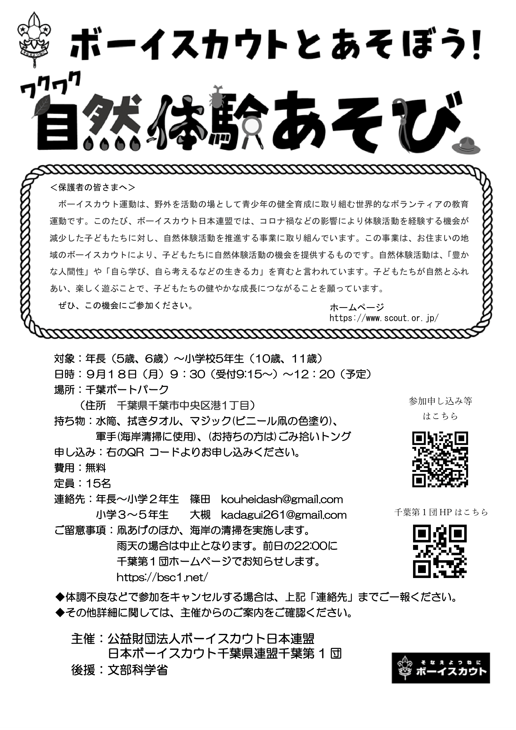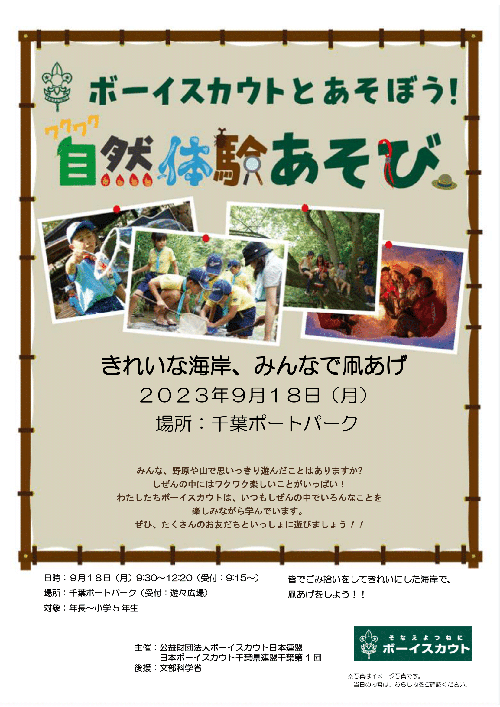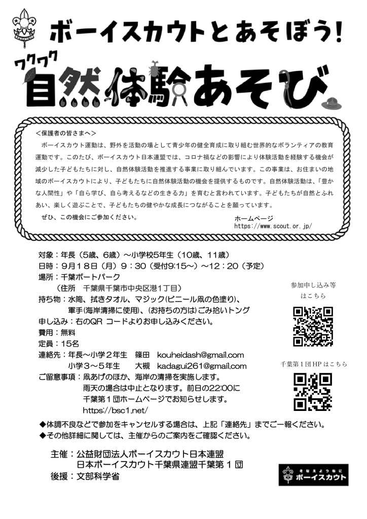 ボーイスカウト千葉1団は千葉ポートパークにてワクワク自然体験あそびを実施予定です。