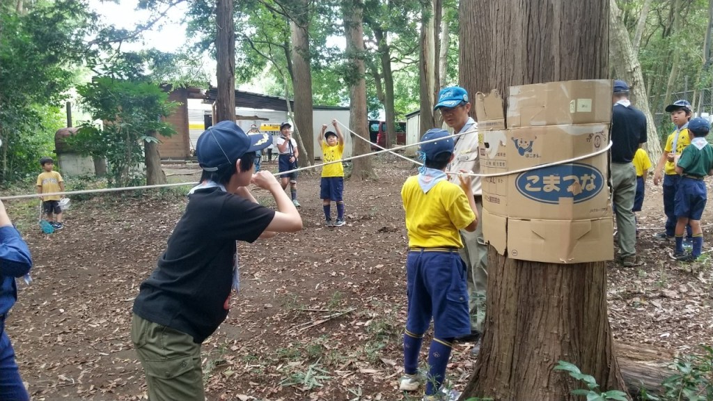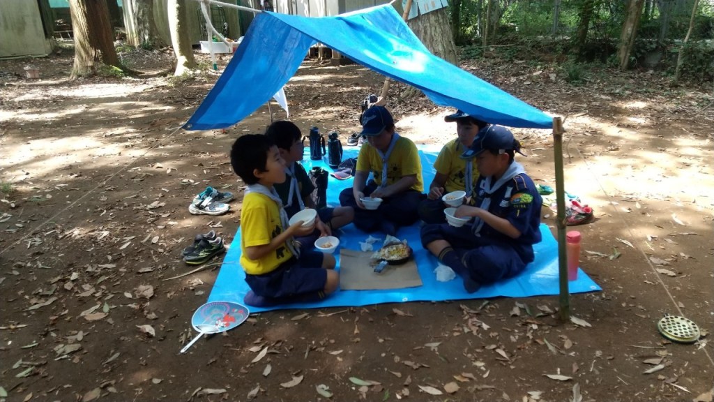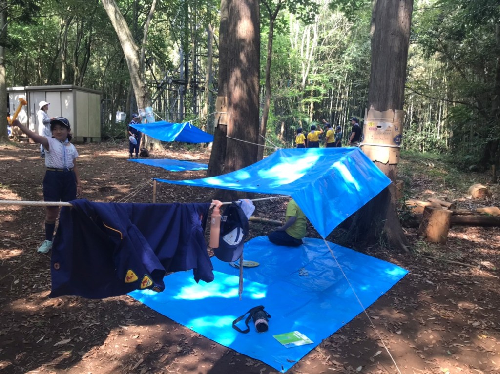 暑い中、秘密基地作りをしました。材料はロープ、ブルーシート、麻紐、森に落ちている木材等、です。仕上げに先週作った旗を飾りました。