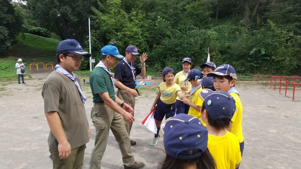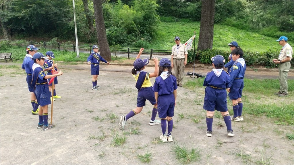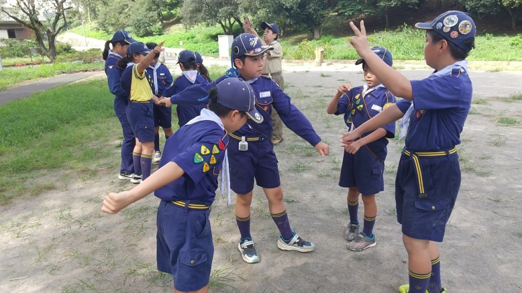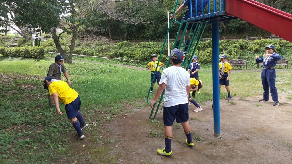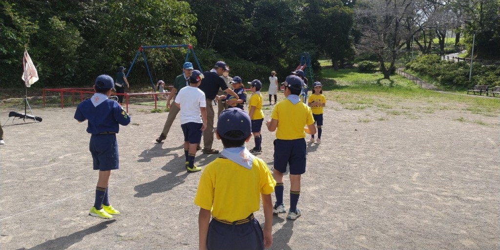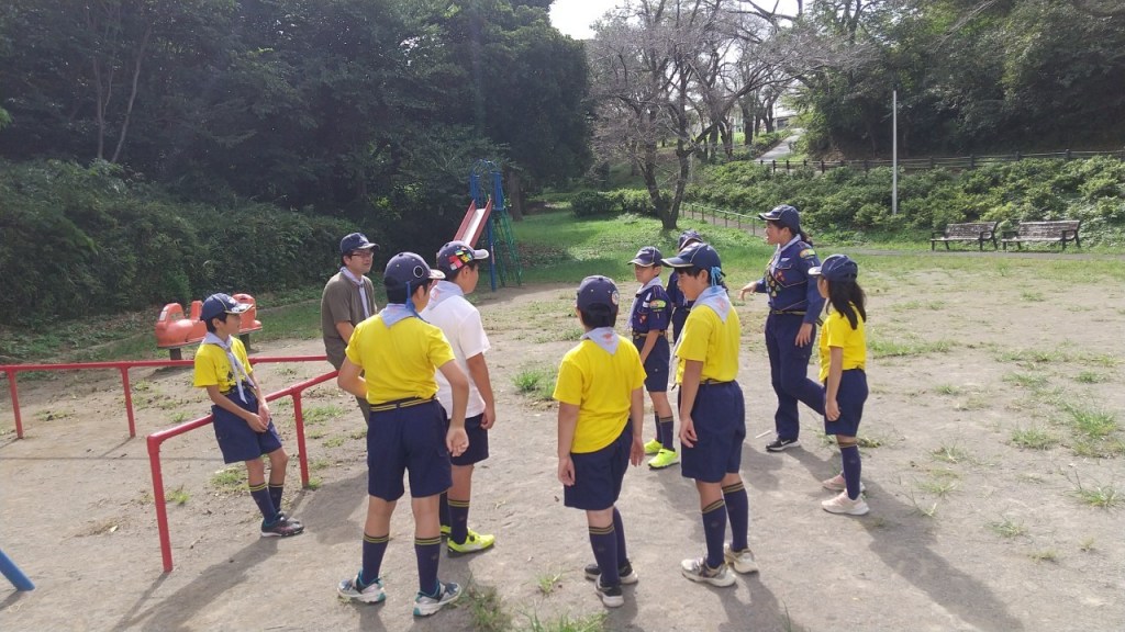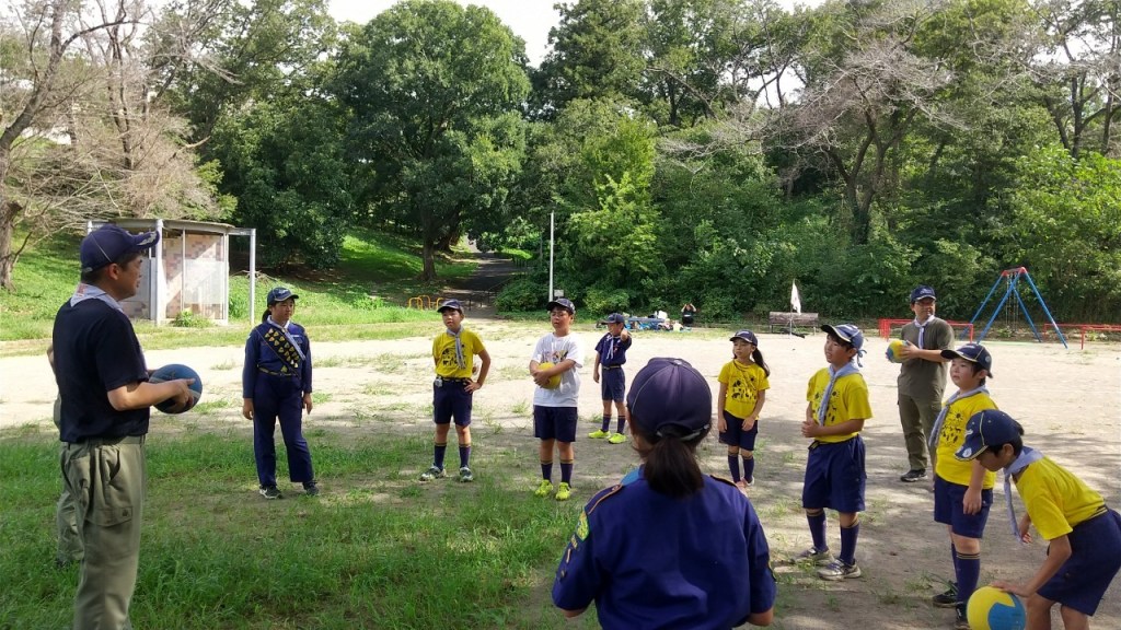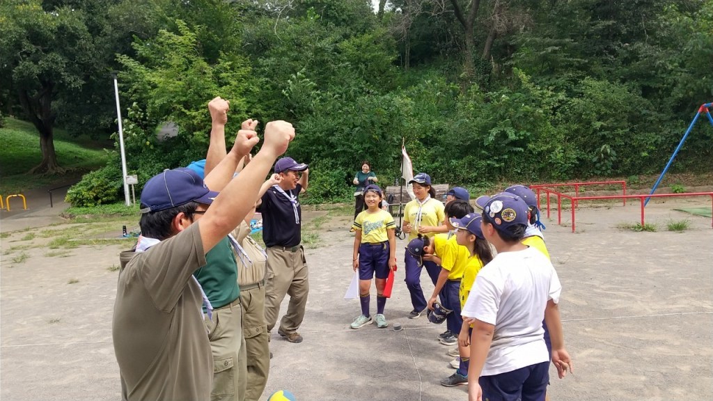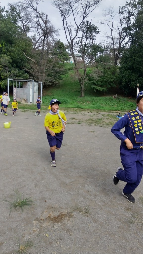 公園ジョギング3周したあと、ストレッチをして体をほぐします。皆で和になり、隊長・副隊長と細かいルール確認をしたあと、組に別れ、