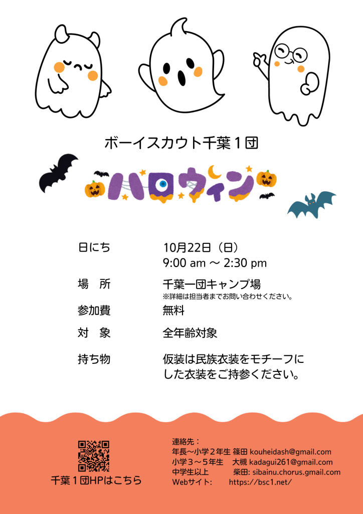 未分類 2023.10.22 団ハロウィンを開催します。 投稿者: Masashi Otsuka 投稿日: 2023年10月14日 来週22日に千葉1団では自団キャンプ場にてハロウィンを開催します。 詳細についてはチラシをご参照ください。 過去の写真 共有: Facebook で共有 (新しいウィンドウで開きます) Facebook LinkedIn でシェア (新しいウィンドウで開きます) LinkedIn いいね 読み込み中…