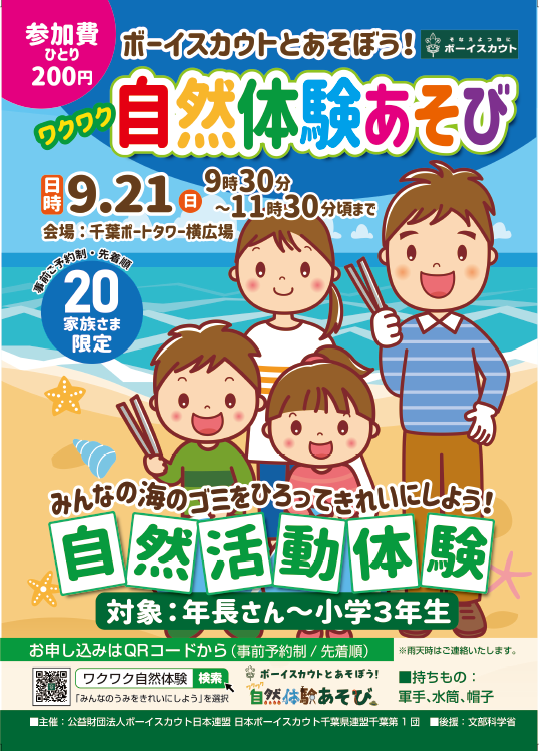 未分類 【参加者募集】みんなでを海のゴミをひろってきれいにしよう!(ワクワク自然体験) 投稿者: Masashi Otsuka 投稿日: 2025年8月31日 わくわく自然体験のお知らせです。 9月21日に千葉1団では千葉ポートパーク横広場にてワクワク自然体験あそびを実施予定です。 近隣のボーイスカウトの活動に興味がある、同世代の子供との交流がしたいお子様のいるご家庭があればぜひご参加ください。 お申込みはこちらよりご予約可能です。(アクセスできない場合はチラシQRコードよりご予約ください)「ワクワク自然体験あそび」申込みページ ※雨天中止の場合は本HPにて前日 9/20 22時頃にお知らせを掲載予定です。 共有: Facebook で共有 (新しいウィンドウで開きます) Facebook LinkedIn でシェア (新しいウィンドウで開きます) LinkedIn いいね 読み込み中…