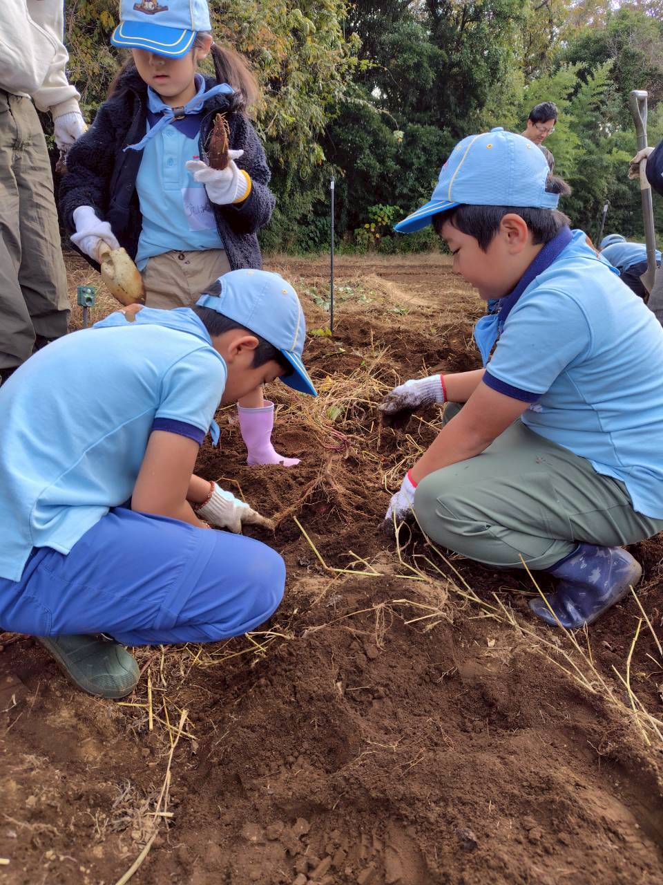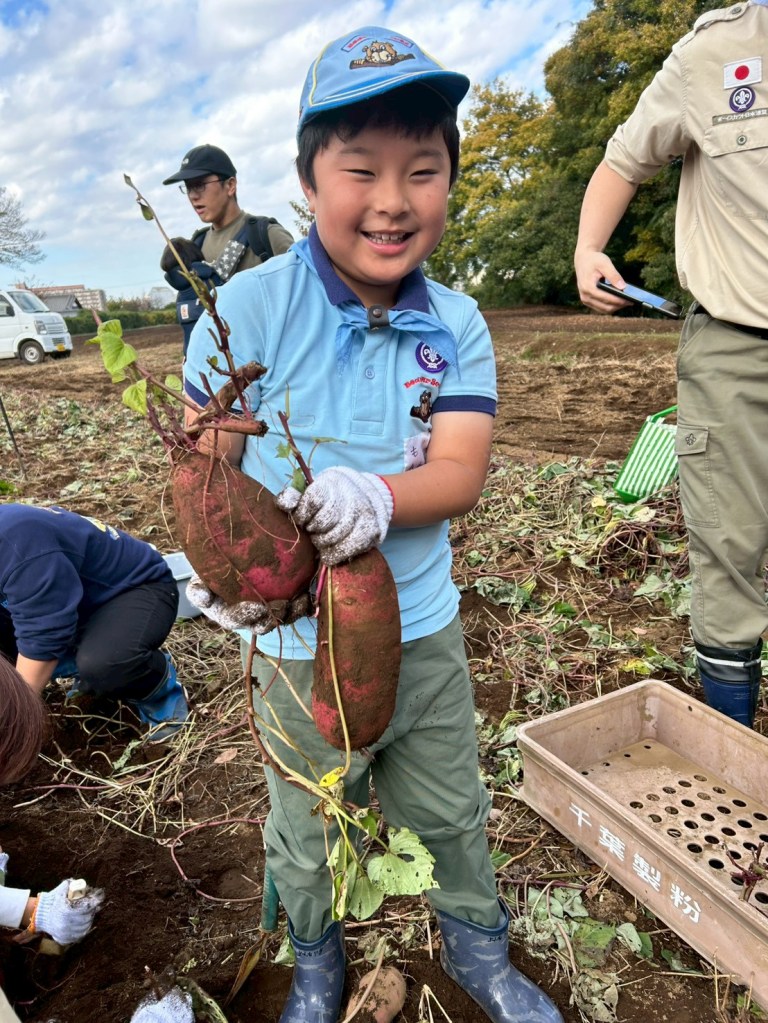 11月16日、千葉6団の隊長さんが育ててくれた畑へ行き、サツマイモ掘りをしました。土の中からは次々と大きなおイモが!みんなで「おっきい!」「まだあるよ!」と大喜びしながら、たくさん収穫することができました。